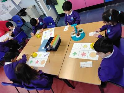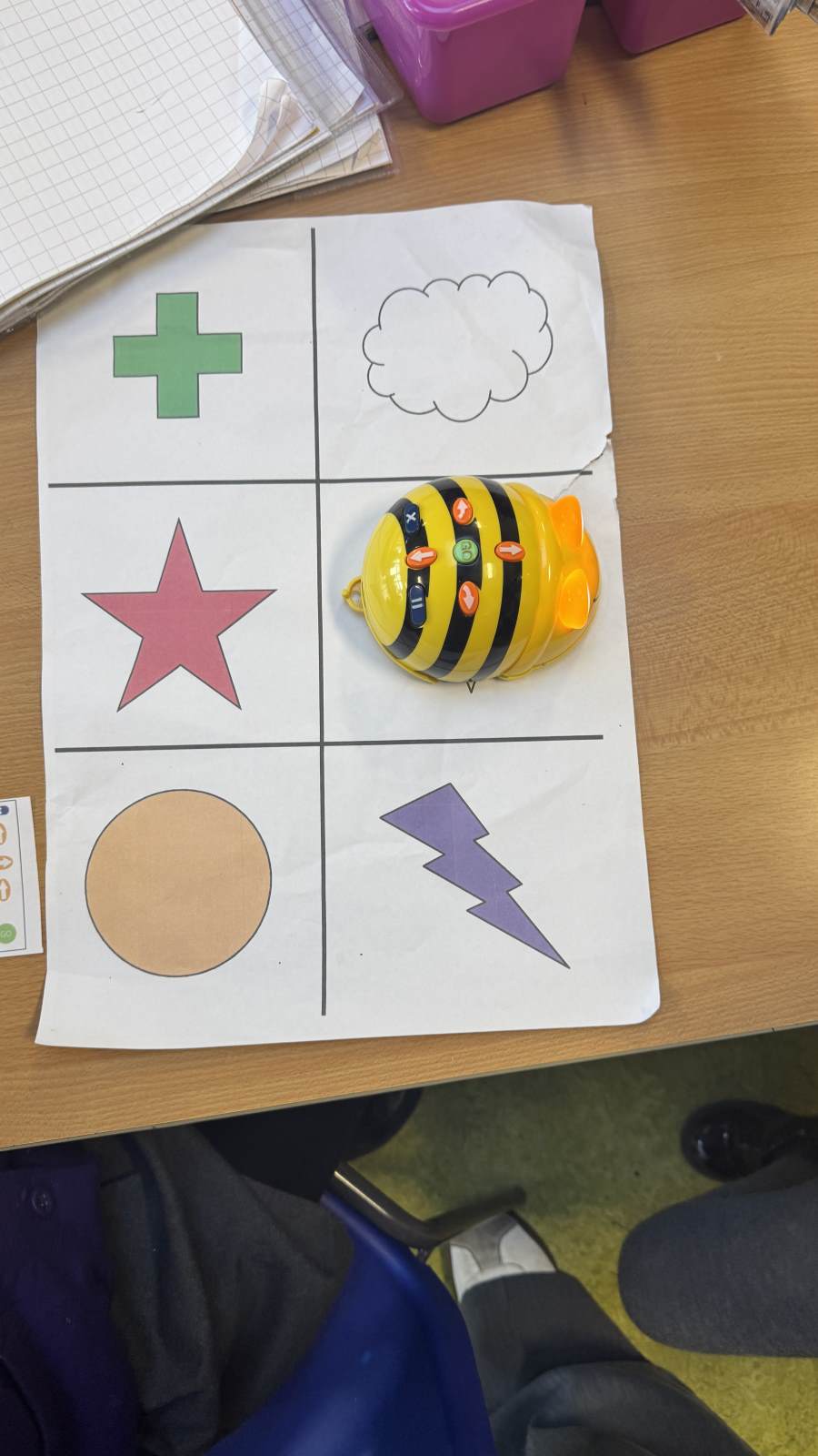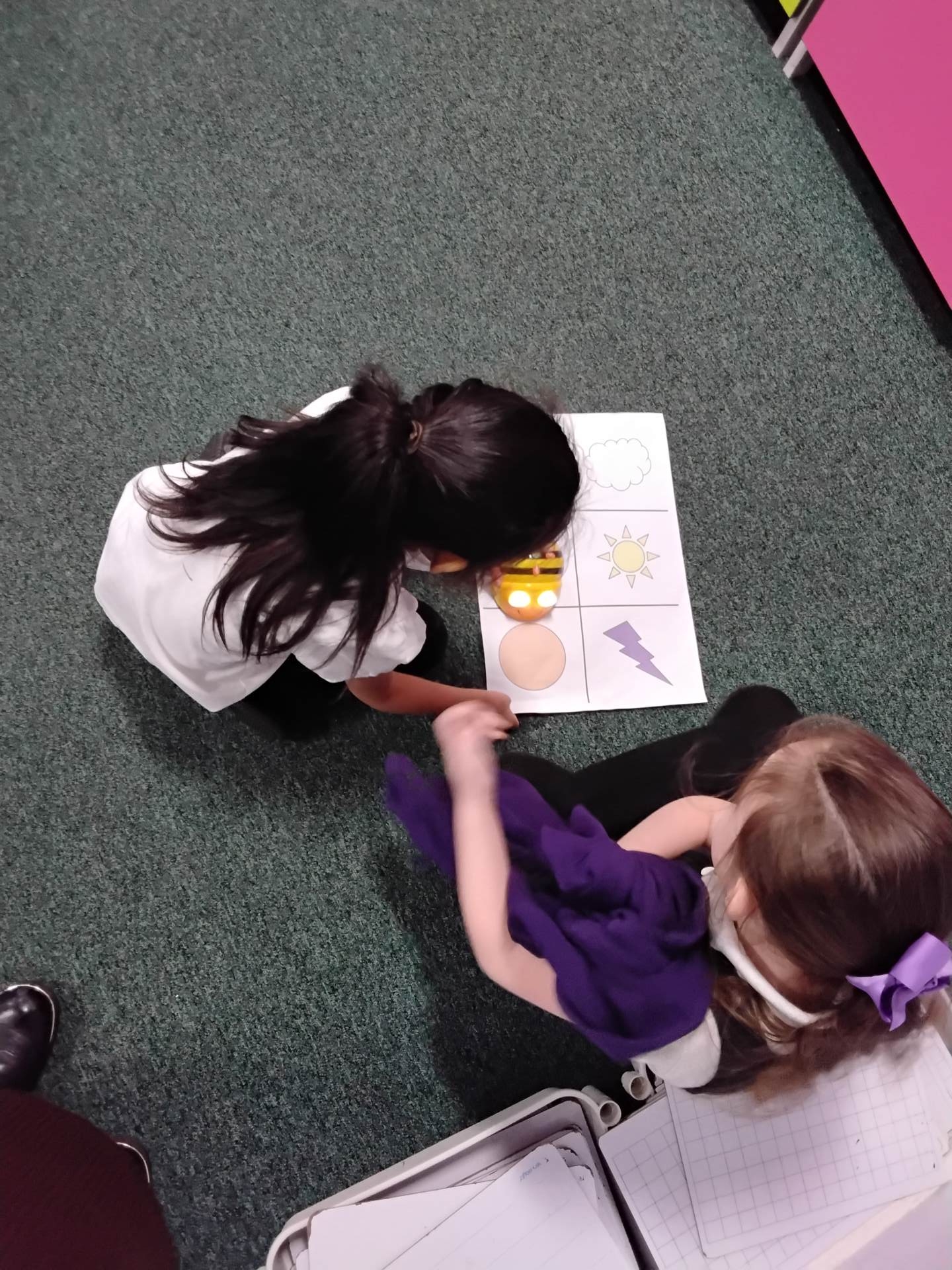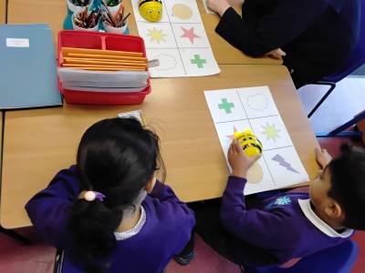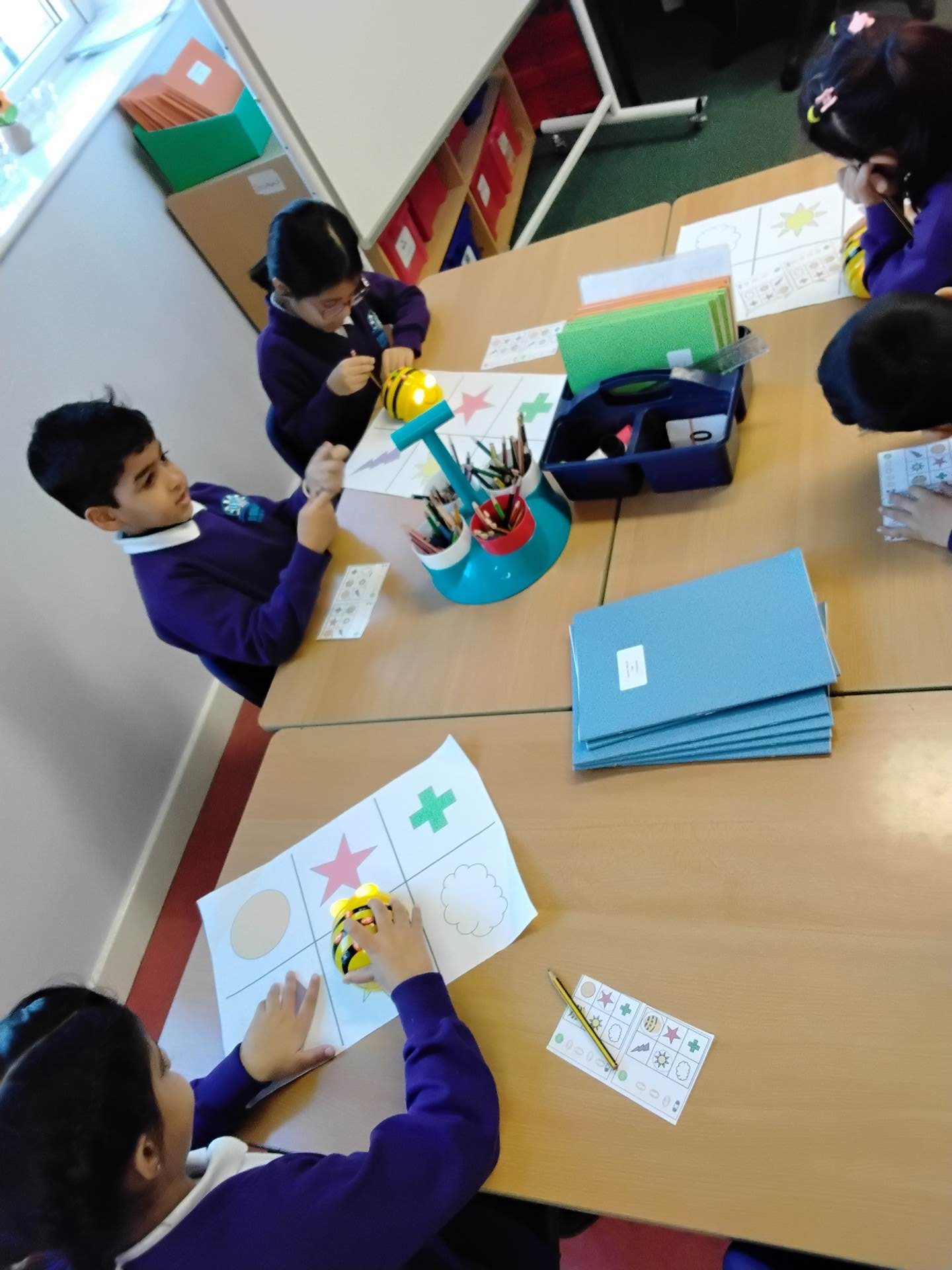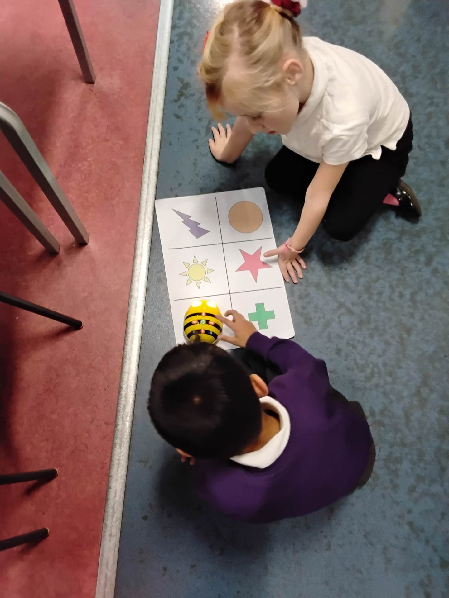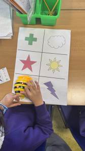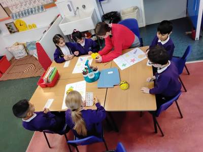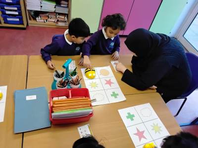 The children have been exploring bee-bots, creating simple algorithms and using clear directions to program the robots.