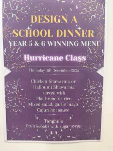 Congratulations to Hurricane class who were the winners of the `Year 5 & 6 Design a Menu` competition. A very tasty menu and very popular with all the children. Thankyou to the amazing Kitchen team who cooked up another delicious treat. We look forward to the next `Design a menu` competition which will be decided by a class from Year 3 or 4.